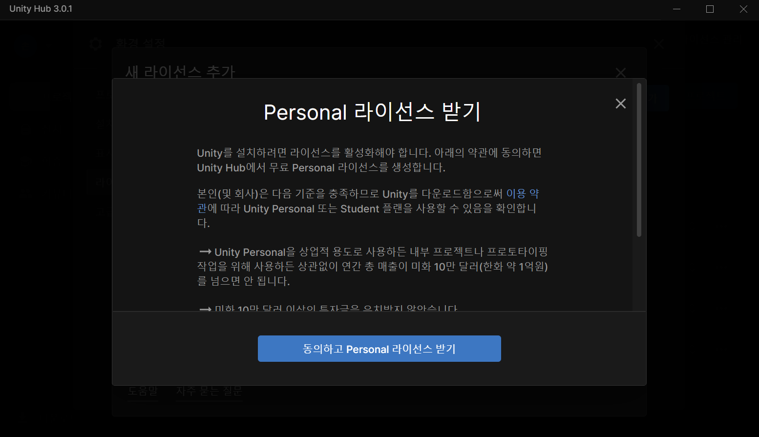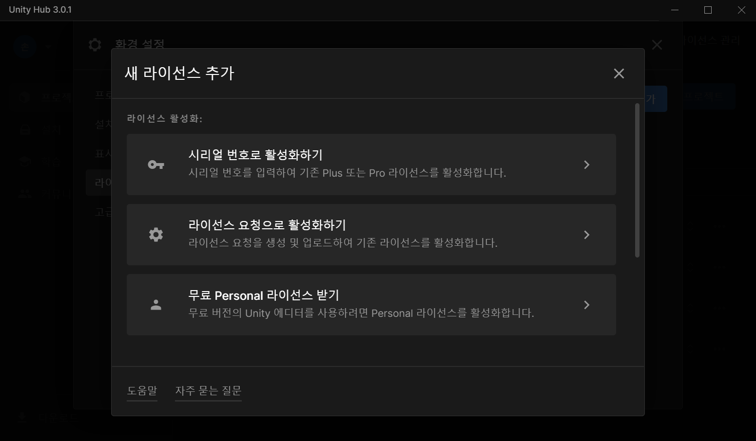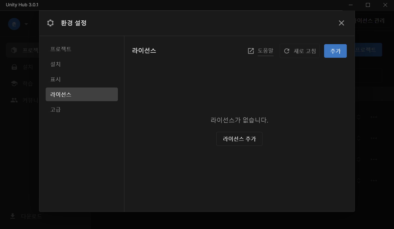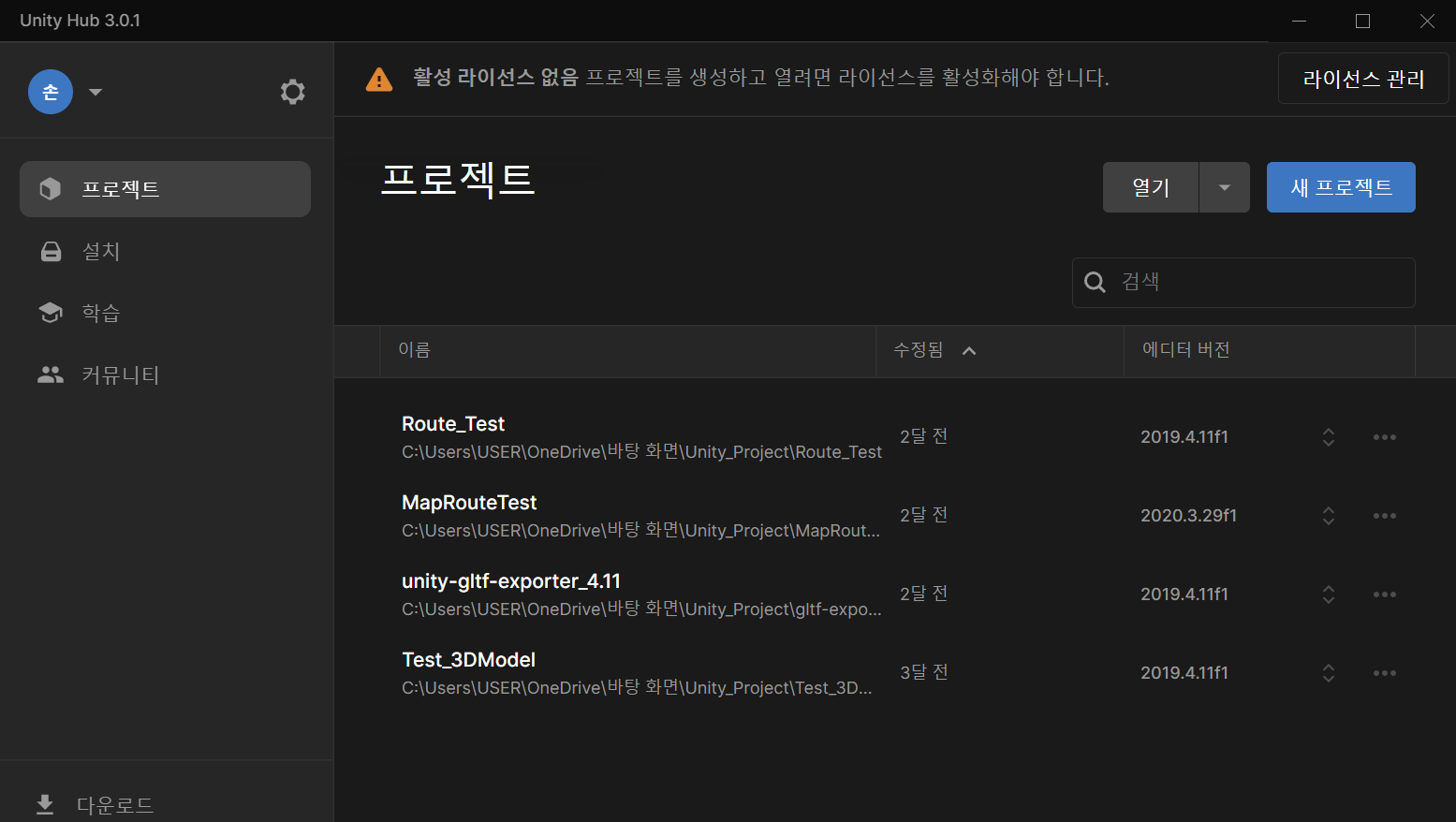 > 오랜만에 유니티 허브를 켜고, 사용하려는 순간, 주황색 경고 아이콘과 함께, '활성 라이선스'가 없다고 한다.