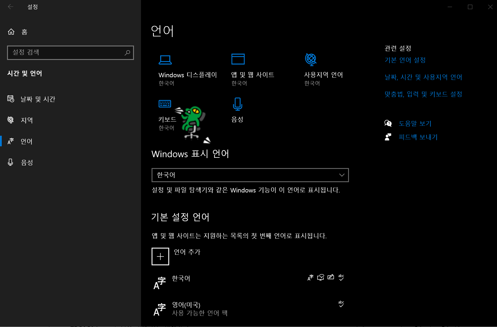 시작 위치는 방법 1과 동일하게, '시간 및 언어' 설정으로 들어간다.