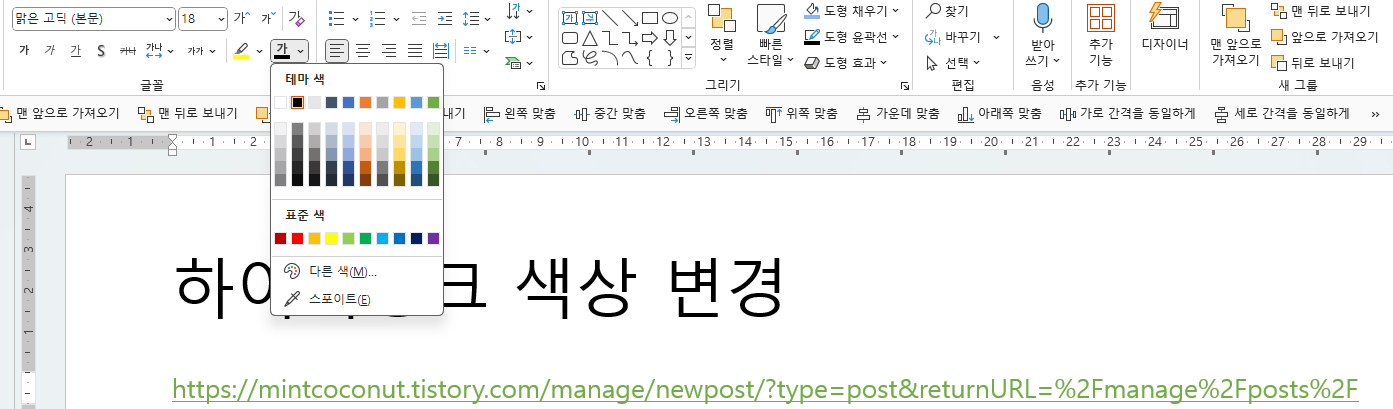 방법 2: 하이퍼링크 삽입 시, 원하는 색상으로 지정, 변경해서 삽입되도록 설정