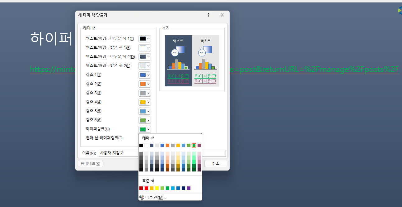> 하이퍼링크 > 색상 변경 > 저장 하여, 색상 변경 확인하기.