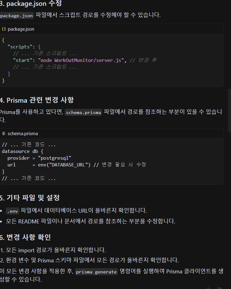 > 해결 과정 6 : 커서 AI를 재시작하고, 프로젝트를 재시작한 뒤, 기존의 폴더명과 현재의 폴더명으로 인하여 발생할 수 있는 오류를 미리 방지하기 위하여, 전체 프로젝트 파일 / 폴더 상, 경로 수정 작업 및 스키마 변경, 적용 작업 수행