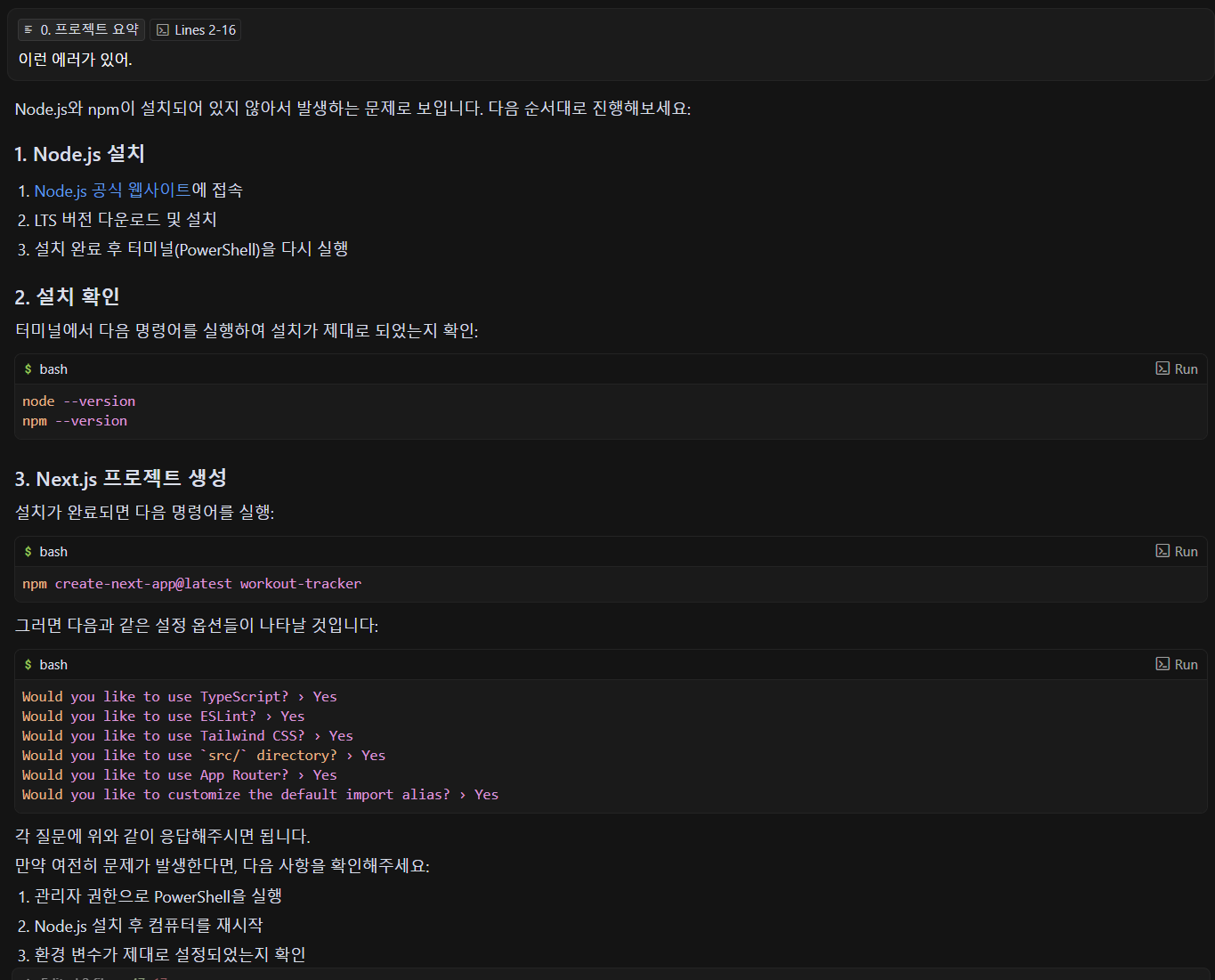 2. Cursor의 조언에 따라서, 문제 원인 확인, Node.js 다운로드, 설치