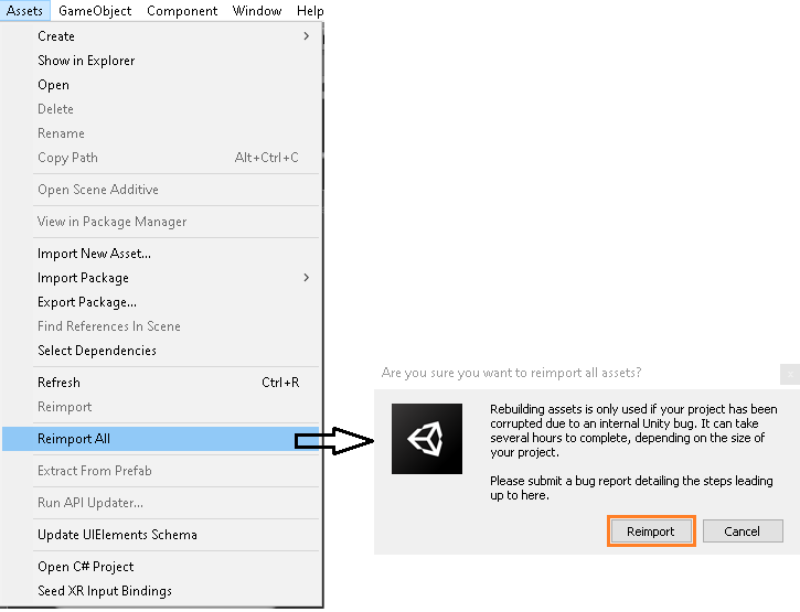 2. Assets - Reimport All 클릭 후, Reimport 선택.