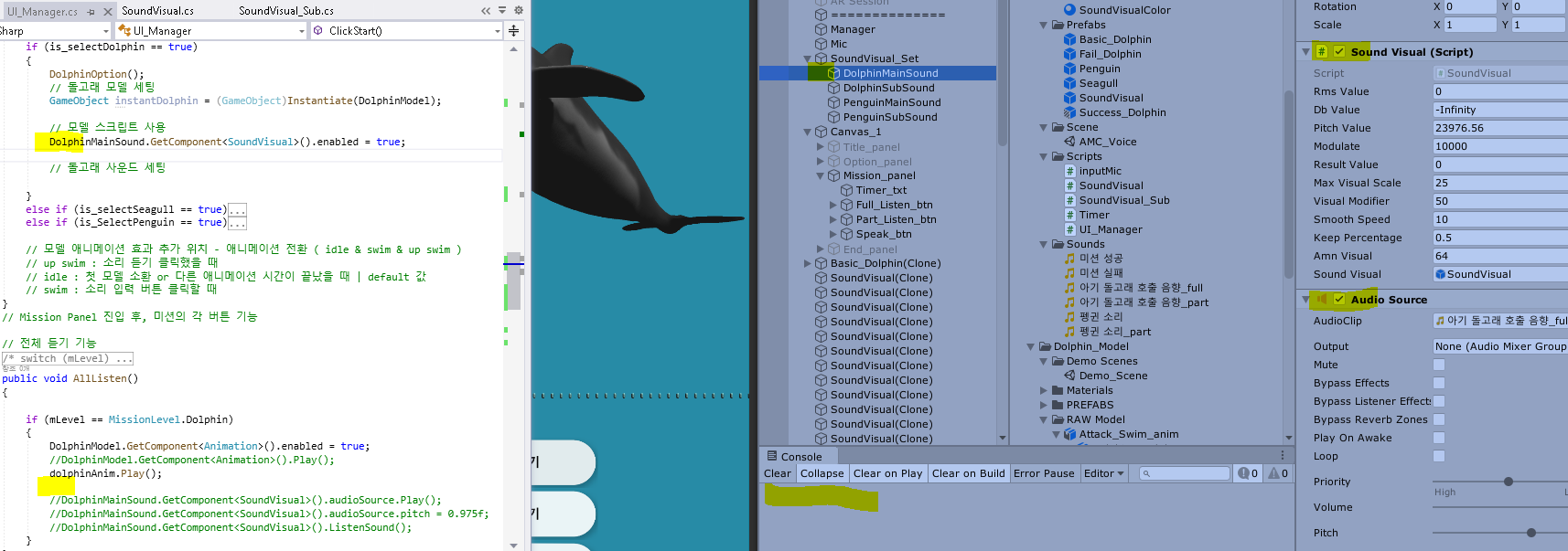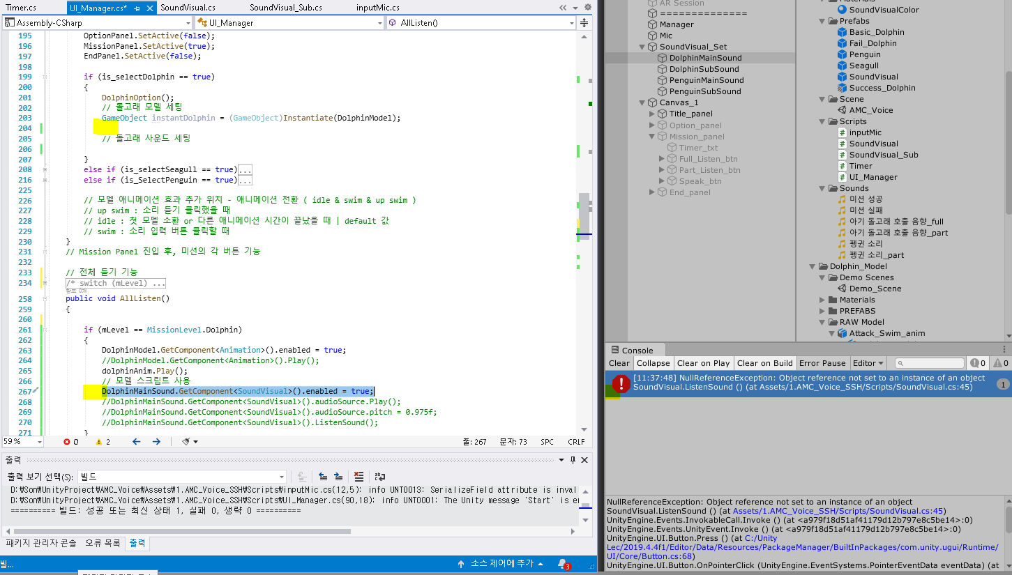 하지만, 생각을 잘못해서, 스크립트가 사용되도록 하는 순간을 버튼을 클릭하면으로 설정했더니, 사운드 스크립트에서 오디오 재생함수를 실행시켜야 하는데, 이를 찾지 못해서, null 참조 예외 상황이 발생했다.
