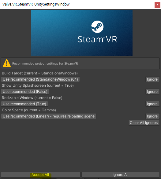 5. 프로젝트에서의 Steam VR 설정 > Accept All 클릭