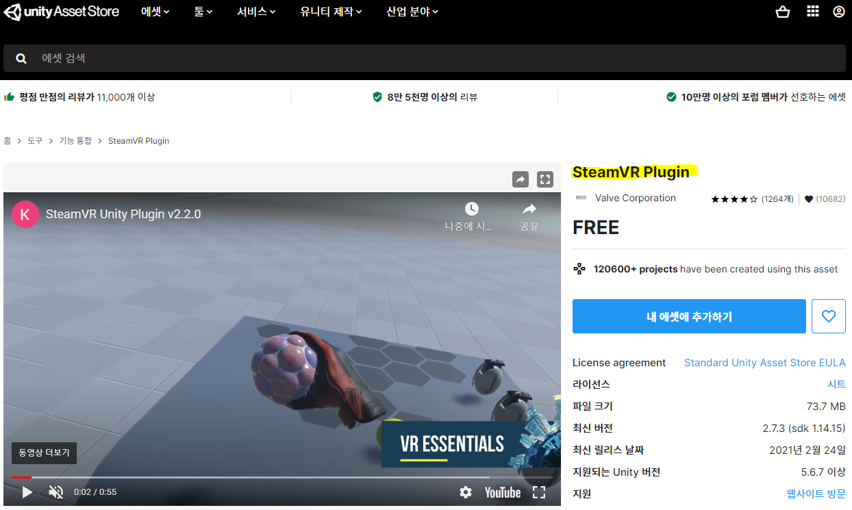 2. Window - Asset Store ( Ctrl + 9 ) 에서 [ Steam VR Plugin ] 검색, 내 에셋에 추가하고, 프로젝트로 돌아오기.