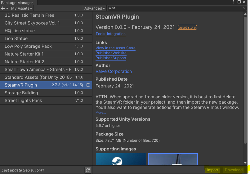 3. Window - Package Manager - My Assets 에서 Steam VR Plugin 을 검색하여 download 후, import 하기.